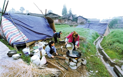 這是蘆山縣龍門鄉(xiāng)古城村古城坪村民小組的震后第二天。灶臺前,駱良杰的媳婦駱育錦和妯娌王萬桃、張冬梅等人正在準備早餐——一大鍋玉米面湯。駱良杰開玩笑說:“這是我們自做的八寶粥?!?/p>
